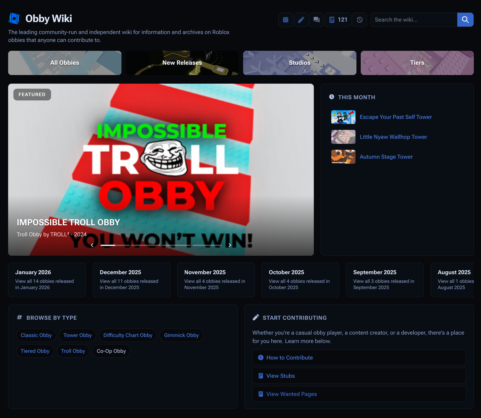 Hi everyone, today we’re excited to show off our new home page for the Obby Wiki. Previously Main Page, the new Home page features a highlight carousel of featured obbies, new releases updated live, an organised archive by month, and detailed new references for new contributors to get editing and contributing. Try it at ObbyWiki.com/wiki/Home.